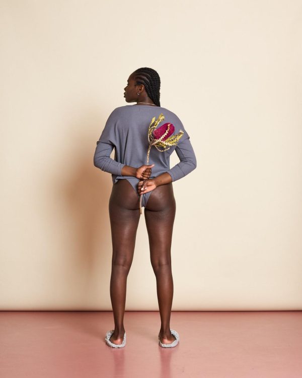 Cropped fit. Our model Ayele is 1,77m tall and wears size L.