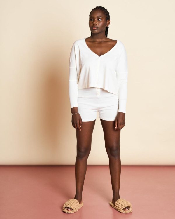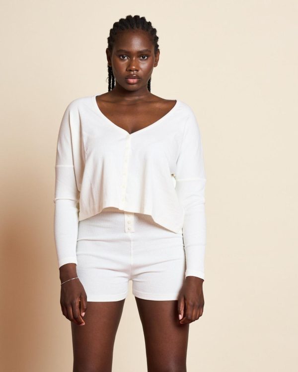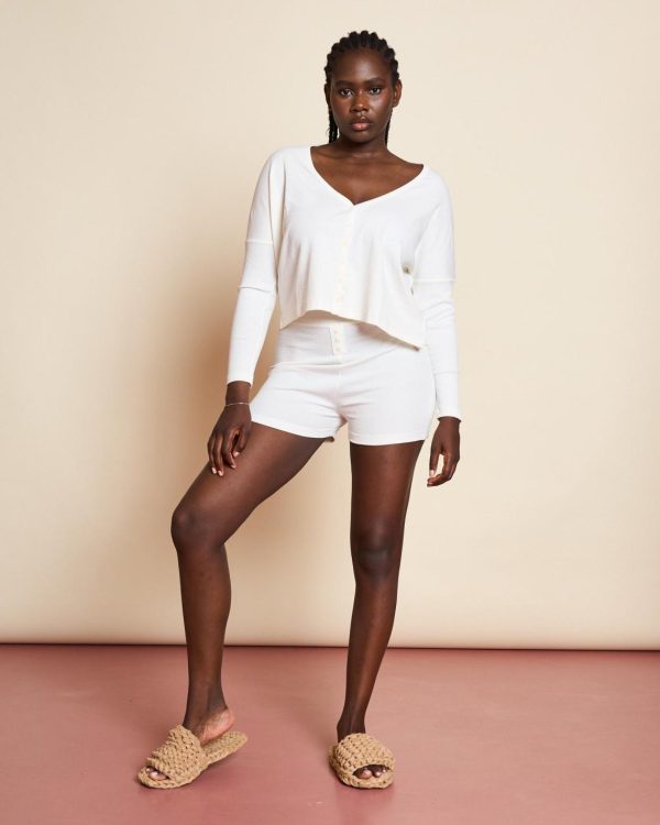 KATLA found its new home. Our new cropped cardigan already is the teams favourite piece for a cozy sunday. The organic RIB fabric makes it light and warm at the same time. The cardigan is made from a very nice organic cotton and SEACELL™ mix. A smartfiber that is extra moisture-regulating, has a smooth and comfortable