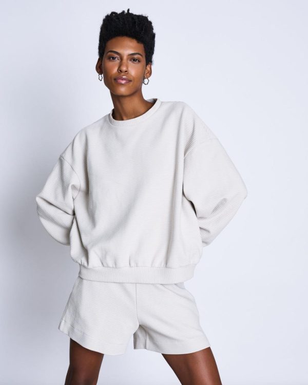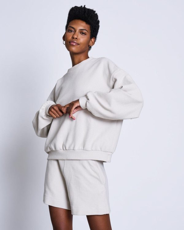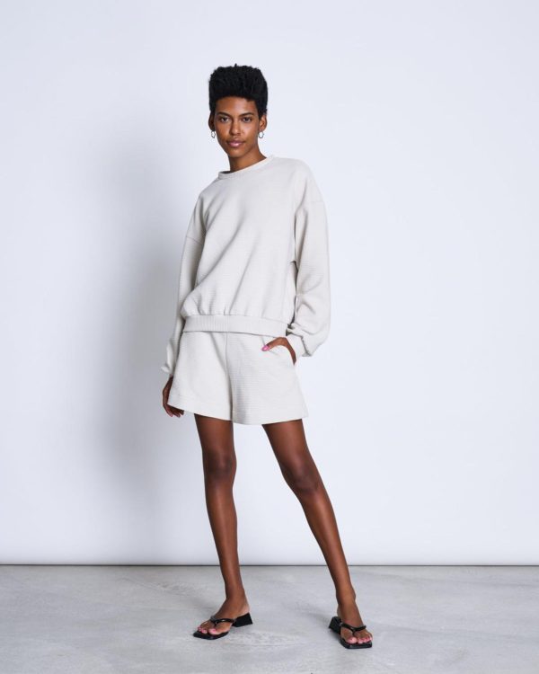 LELITA is our wide shorts made of our Ottomande Interlock fabric. We love the suddle look of the horizontal lines, that gives every piece a super straight look, no matter how loose and comfy the cuts are.LELITA is made of 99% GOTS certified organic cotton and 1% elastan.