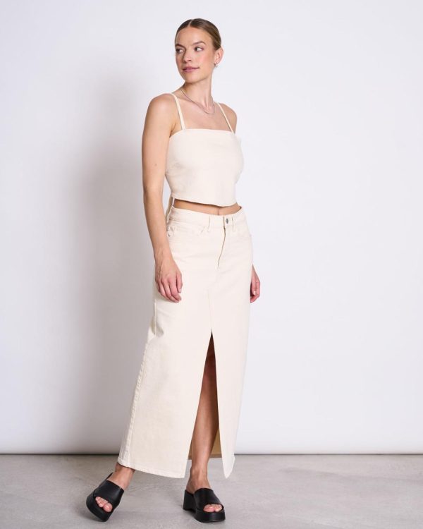 Denim over denim You may know and love a similar cut already, from our bow tops of our linen and bridal collections. Now it shines new in denim.SERA has a straight neckline and adjustable bow on the back. It is slightly tapered at the front hem. Complete SERA with…Jeans SELENE and ALBA Denim skirt LUCE Denim jacket A