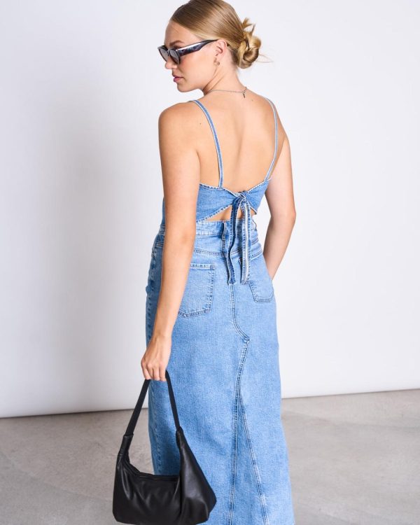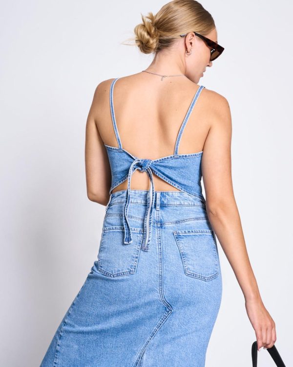 Denim over denim You may know and love a similar cut already, from our bow tops of our linen and bridal collections. Now it shines new in denim.SERA has a straight neckline and adjustable bow on the back. It is slightly tapered at the front hem. Complete SERA with…Jeans SELENE or ALBA Denim skirt LUCEYou may know ou
